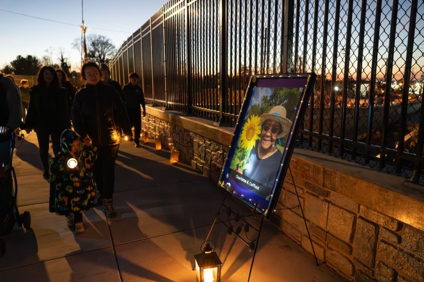 - Elmoria Stewart (Lyttonsville), who decorated the portrait of Charlotte Coffield placed in the middle of the bridge and adorned the 20 white lanterns carried in honor of Charlotte with sunflowers to match. (Portrait credit: Alan Bowser). And Miriam Pemberton (North Woodside) for setting up paper bag lanterns across the bridge.