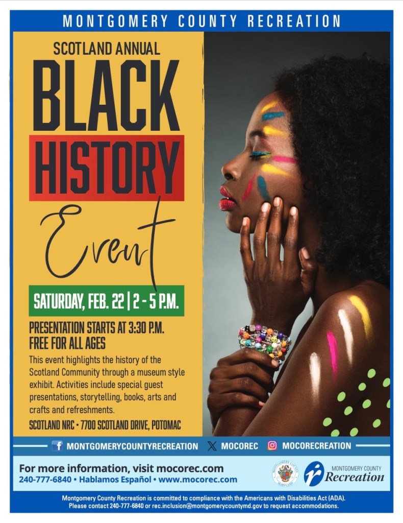 The Scotland Community’s Annual Black History Event will take place from 2-5 pm, Saturday, February 22, 2025 at the Scotland Neighborhood Recreation Center (7700 Scotland Drive, Potomac, Maryland).