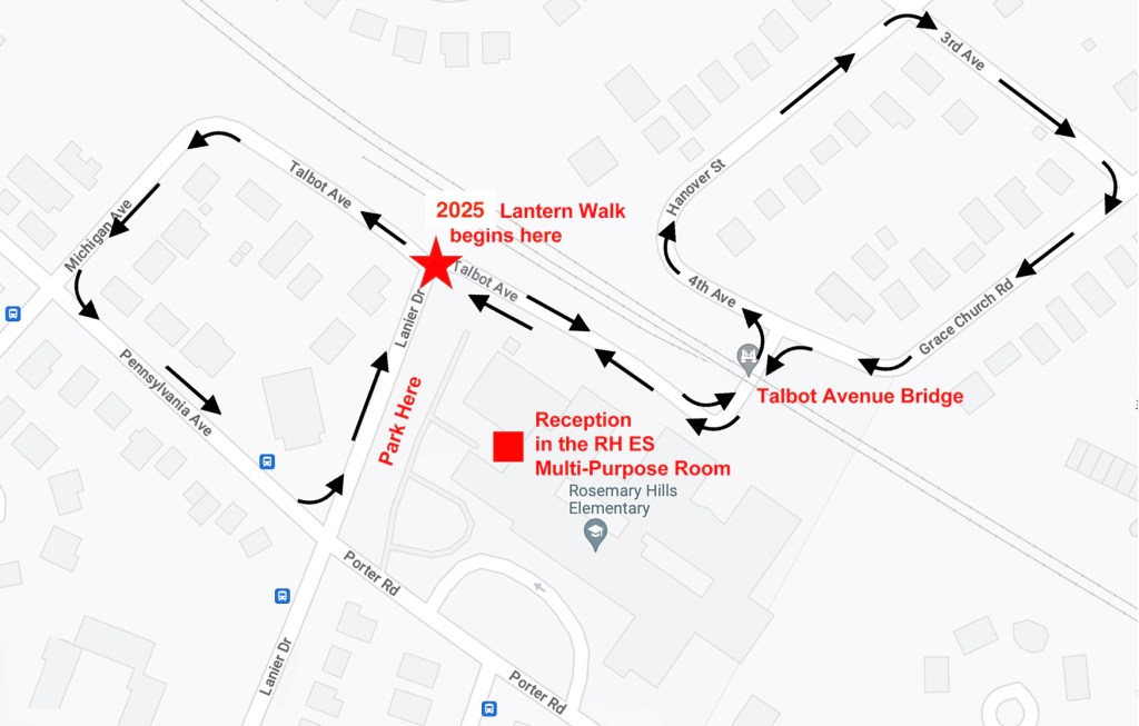 The Lantern Walk will conclude with an indoor community reception at Rosemary Hills Elementary School. All participants are invited to join us for refreshments, music, an art activity for kids, and warm mingling! The reception will be held in the school’s all-purpose room, which is accessible from the Lanier Dr. side of the school, right next to where the Lantern Walk will start and end.