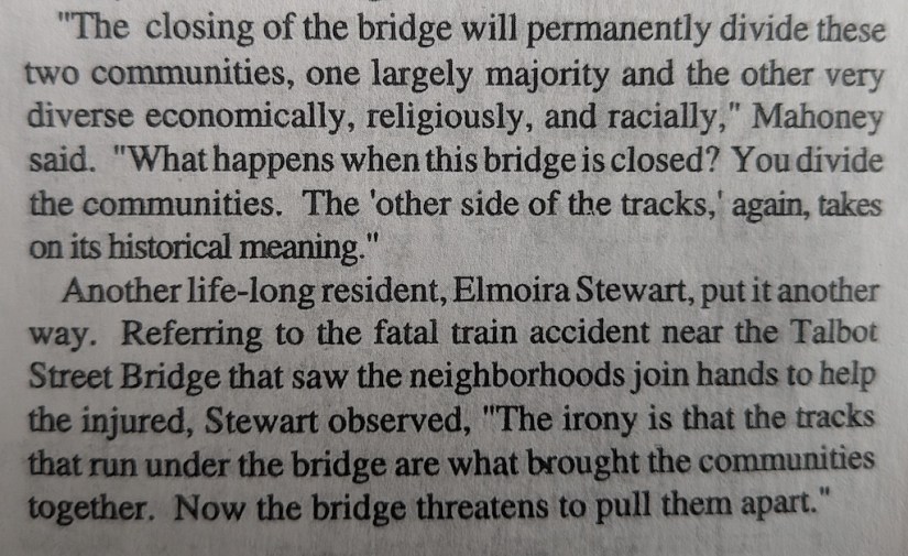 While disagreement between the neighborhoods on either side of the historic Talbot Avenue Bridge over keeping open or closing the bridge preceded the train crash and continued after it, neighbors who lived on both sides of the bridge were united in helping those injured in the crash.